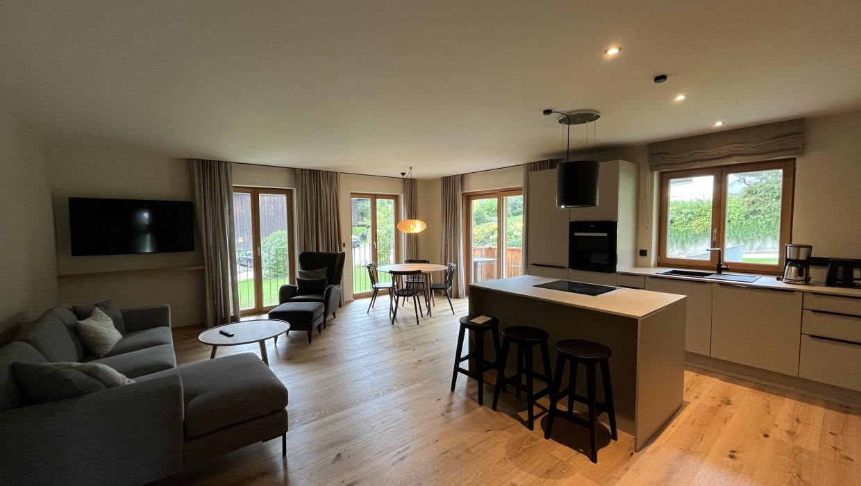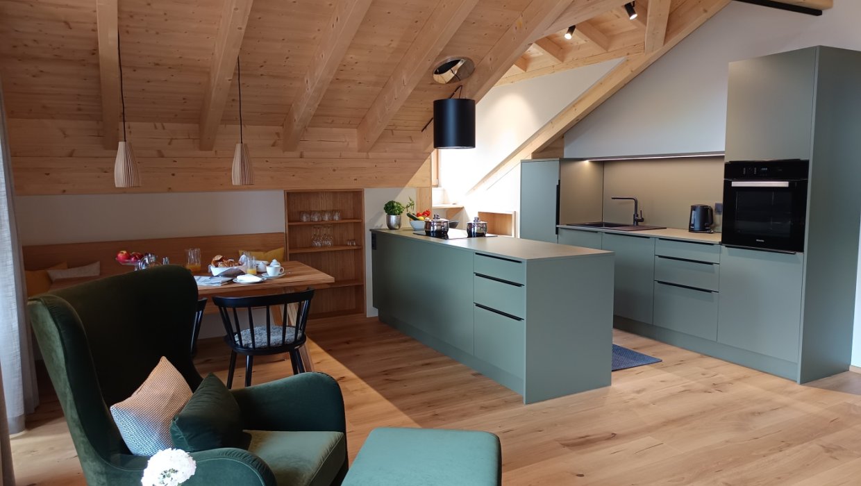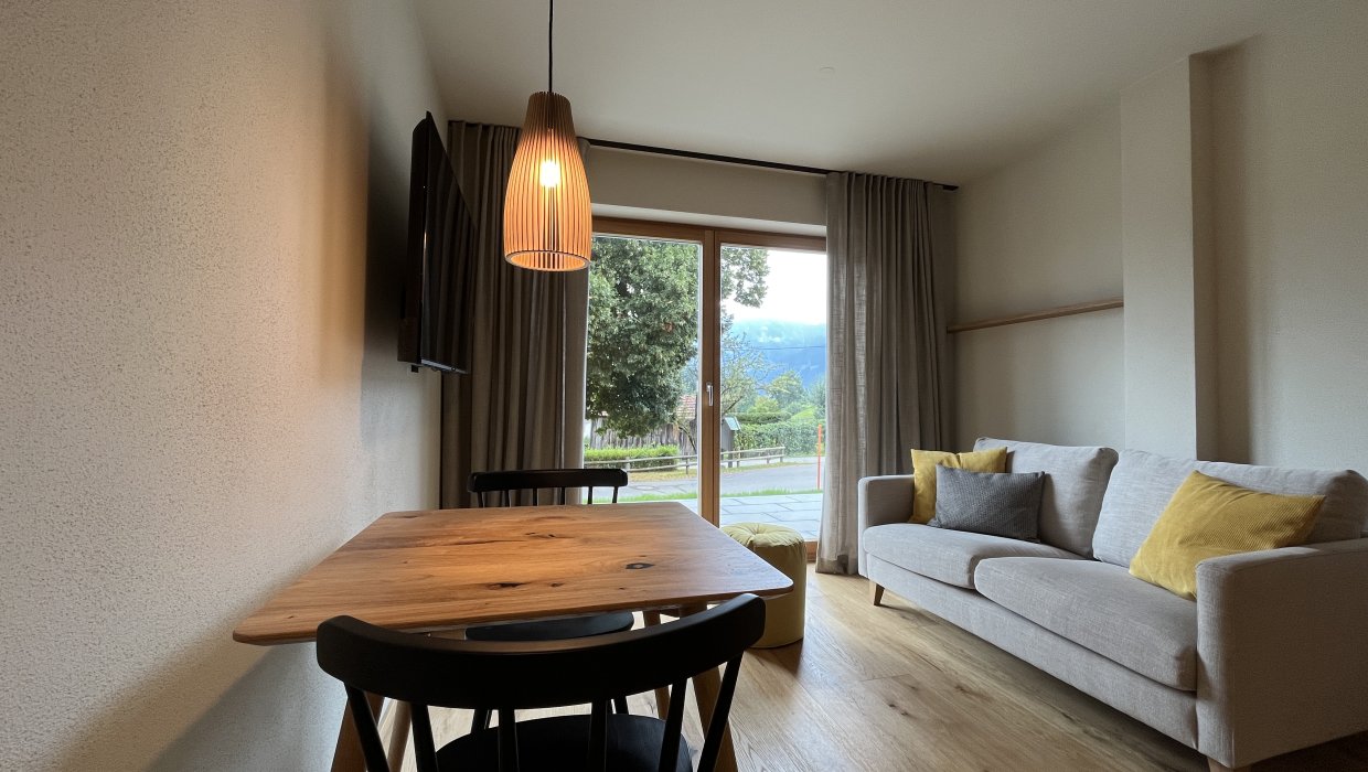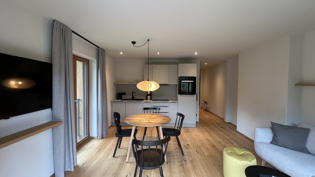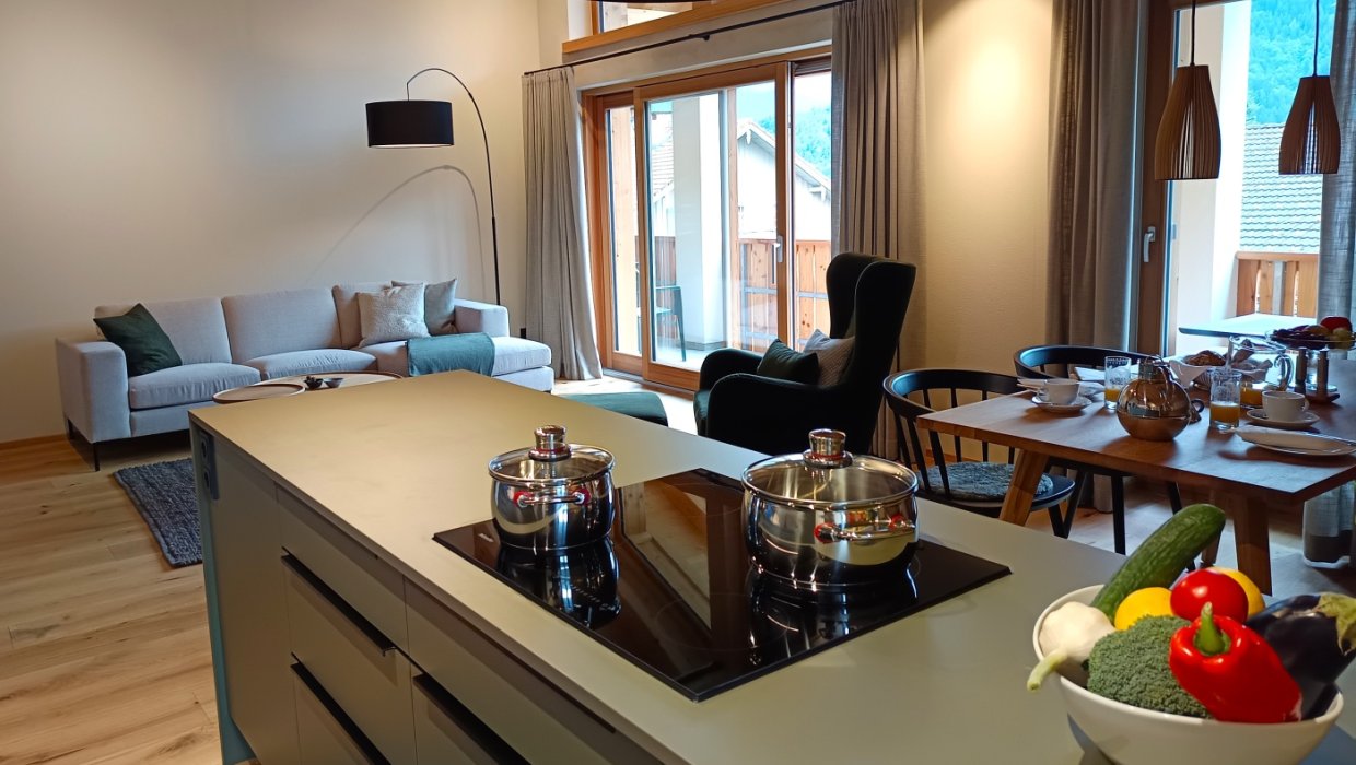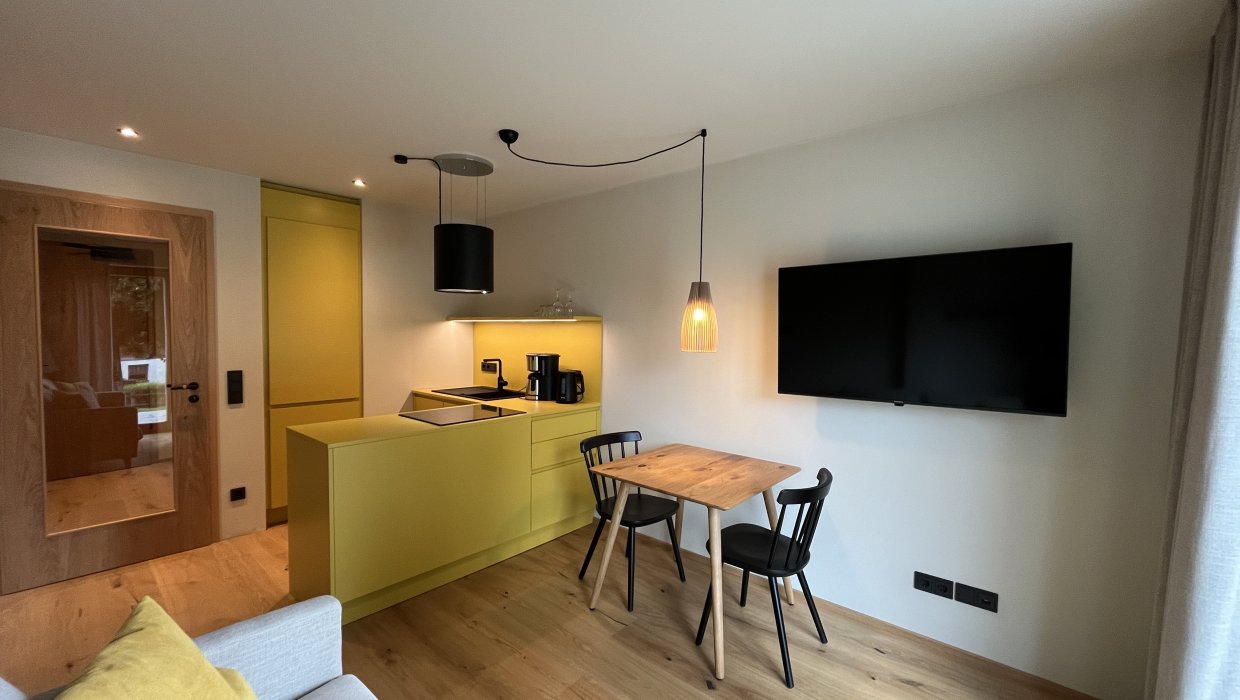 Hier lässt es sich gut sein. Die großzügige Terrasse mit Panoramablick lädt zum Durchatmen ein, während die offene Wohnküche mit Spülmaschine, Kühlschrank und Herd bestens ausgestattet ist. Am Esstisch für zwei lässt sich der Tag entspannt starten – ob mit Kaffee in der Morgensonne oder einem gemütlichen Abendessen.