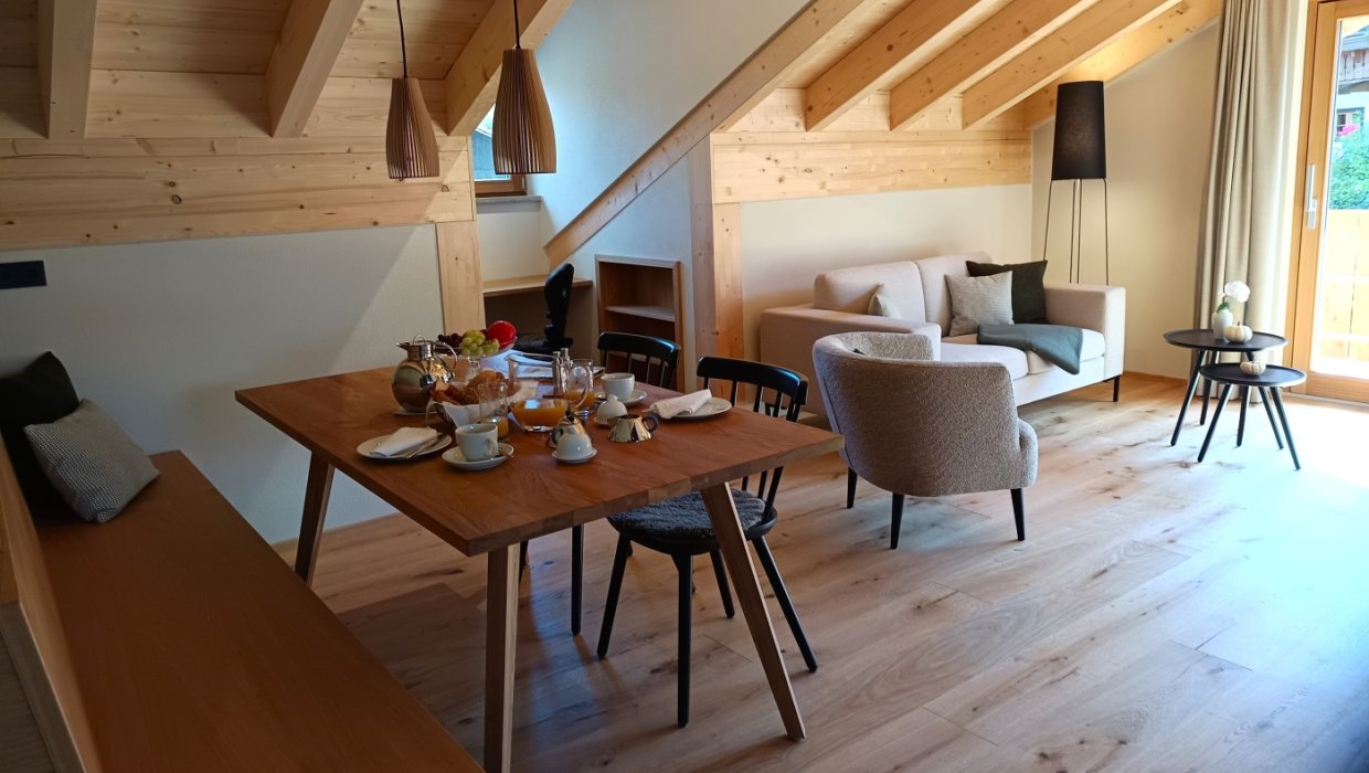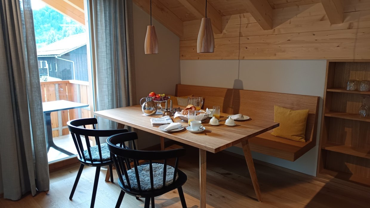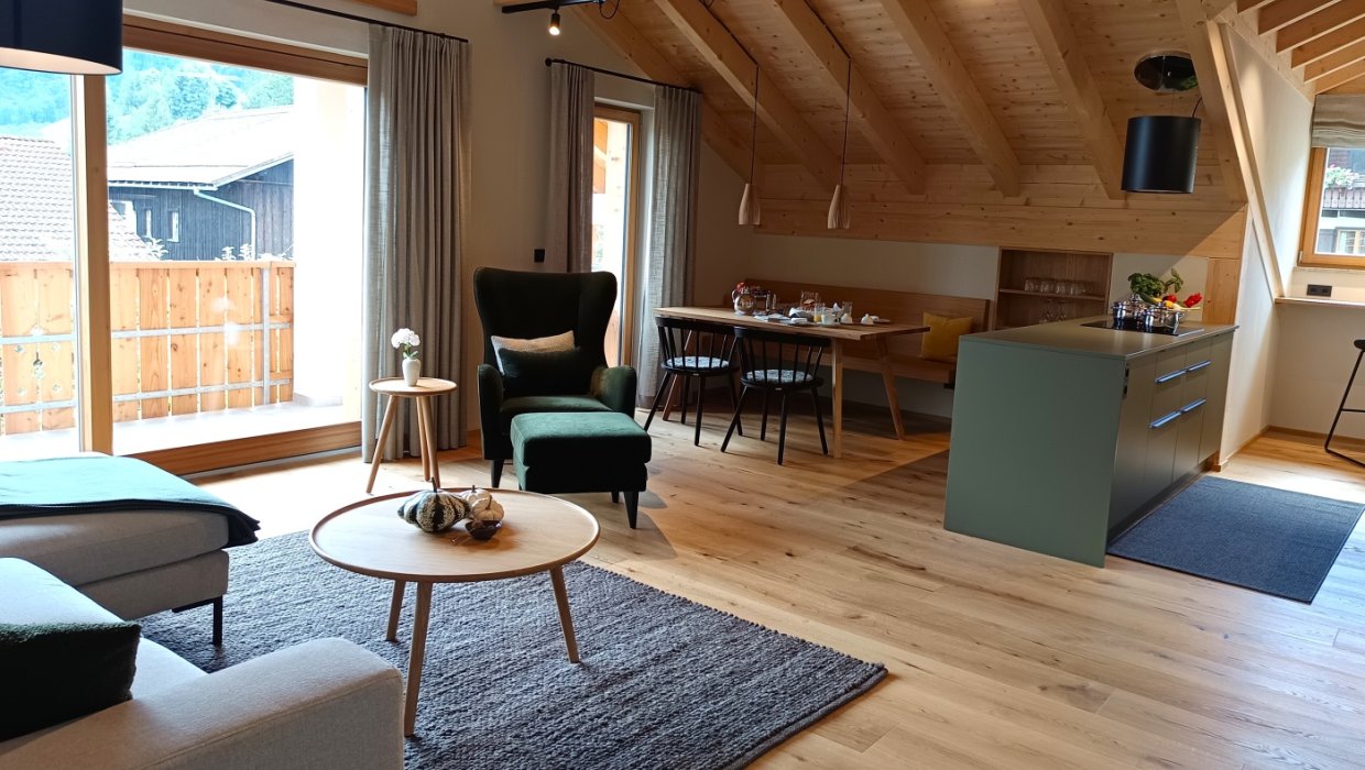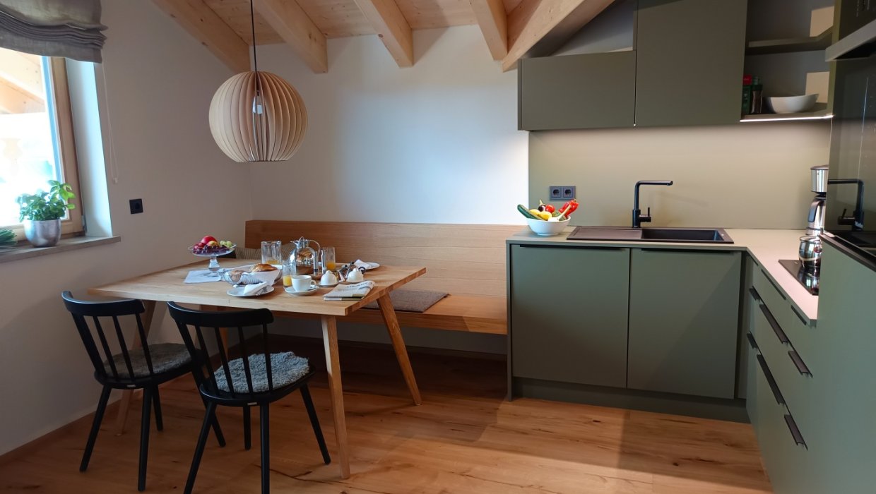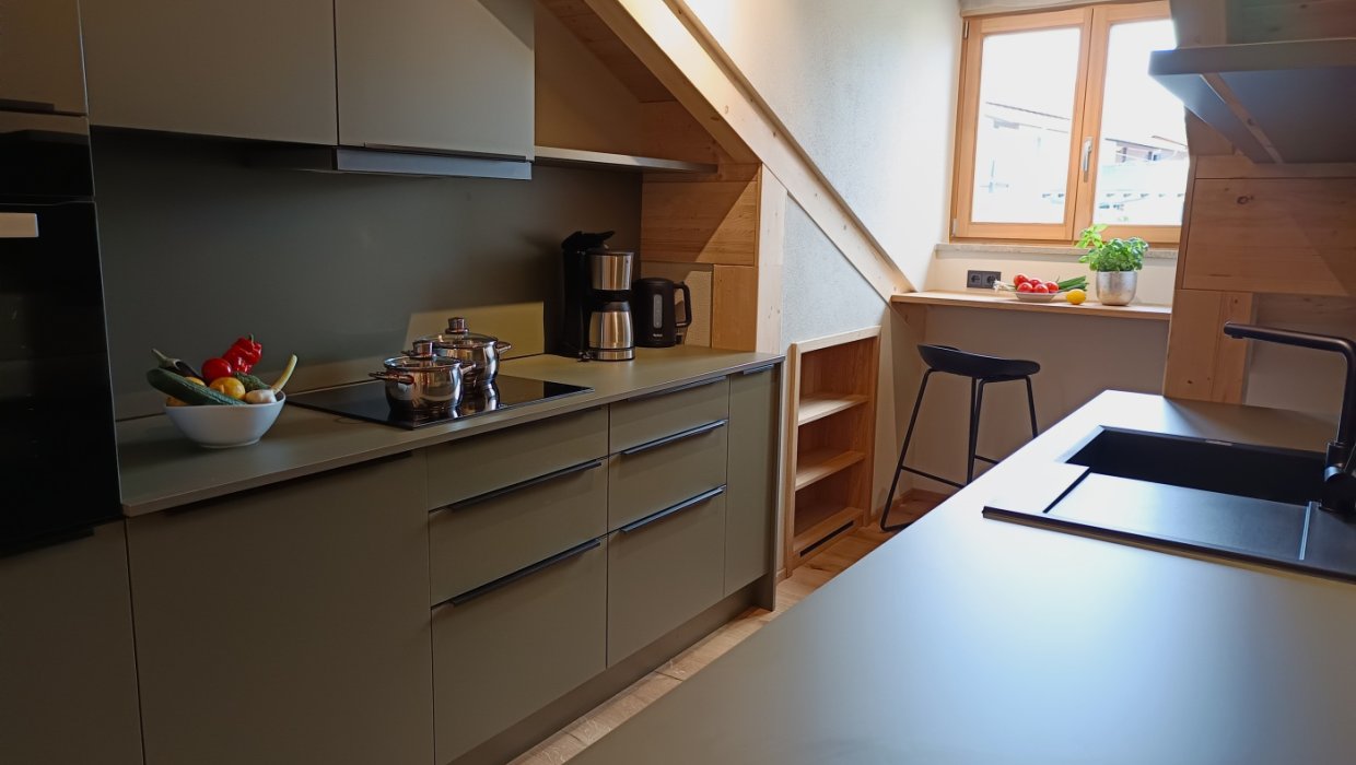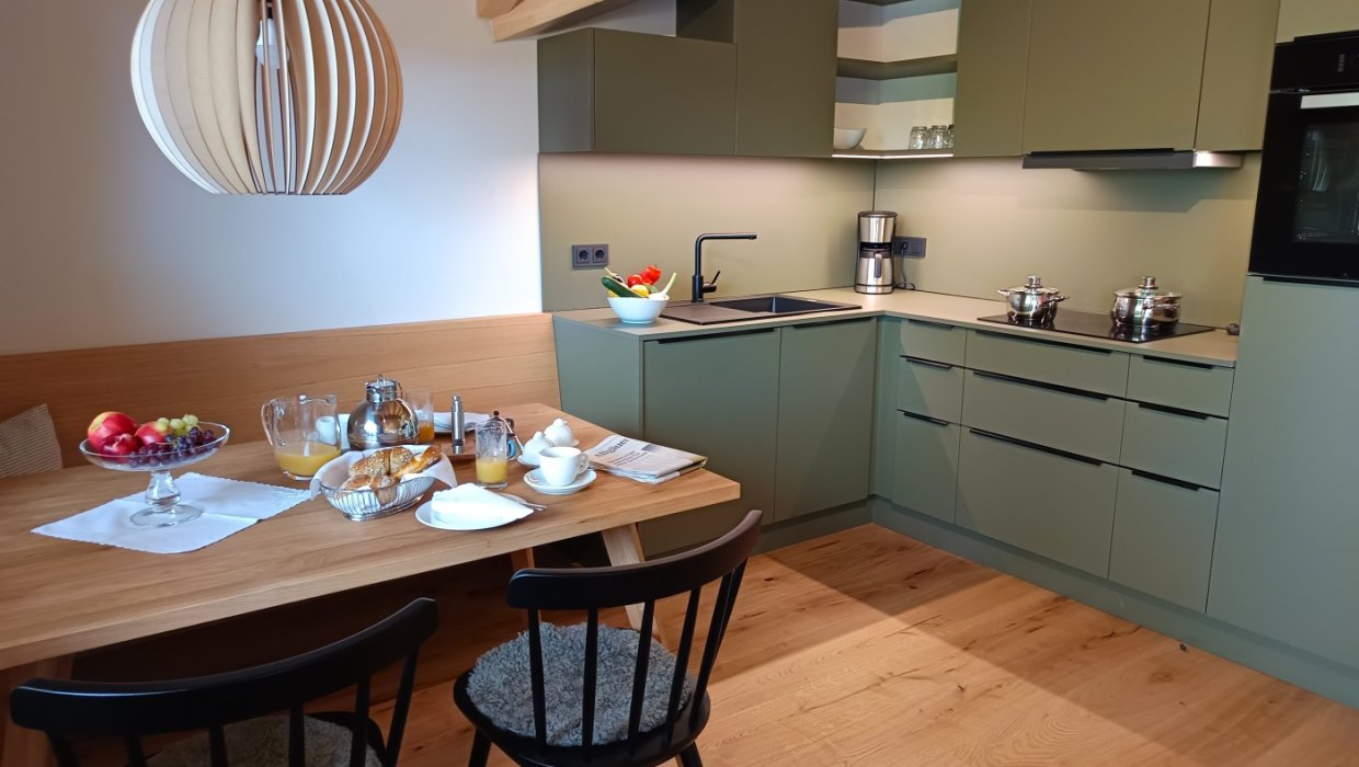 Hier lässt es sich gut sein. Die großzügige Terrasse mit Panoramablick lädt zum Durchatmen ein, während die offene Wohnküche mit Spülmaschine, Kühlschrank und Herd bestens ausgestattet ist. Am Esstisch für zwei lässt sich der Tag entspannt starten – ob mit Kaffee in der Morgensonne oder einem gemütlichen Abendessen.
